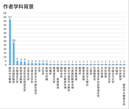 本次论坛投稿人的专业背景以国际中文教育和汉语国际教育为主,两者合计占比超过六成,体现出该领域较强的专业集中度。中国语言文学、思想政治教育、语言学及应用语言学等专业也有一定数量的投稿。此外,还包括汉语言文学、汉语言文字学、马克思主义中国化研究、文艺学、新闻与传播等多个专业方向,以及传播学、俄语语言文学、翻译、国际关系、教育学、人类学、外国语言学、中国古代文学等广泛学科背景的投稿人参与。这一分布特征充分说明,本论坛在语言教学、文化传播、跨文化交流、中国形象构建等多个维度上的内容涵盖,凸显出“多学科交叉融合发展”的鲜明特点,为主题研讨提供了多元化的学术视角。
